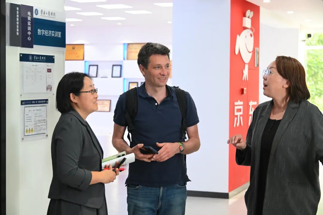 Thomas Mailart 先生一行先后实地考察了学校多个教学科研平台及学生生活社区。围绕学校“办强工科,办特商科”的办学定位,参访团先后走进华为无线技术实训中心、工程训练中心,深入了解学校在传统工科人才培养与多元复合智能型人才培养融合发展方面的实践成果。在京东产教融合学院,Thomas Maillart 先生与参与助农直播的学生亲切交流,并品尝昆明特色蓝莓,对学校应用型人才培养模式给予高度评价,称赞“这是非常棒的教育模式,也是最好的产教融合案例”。
