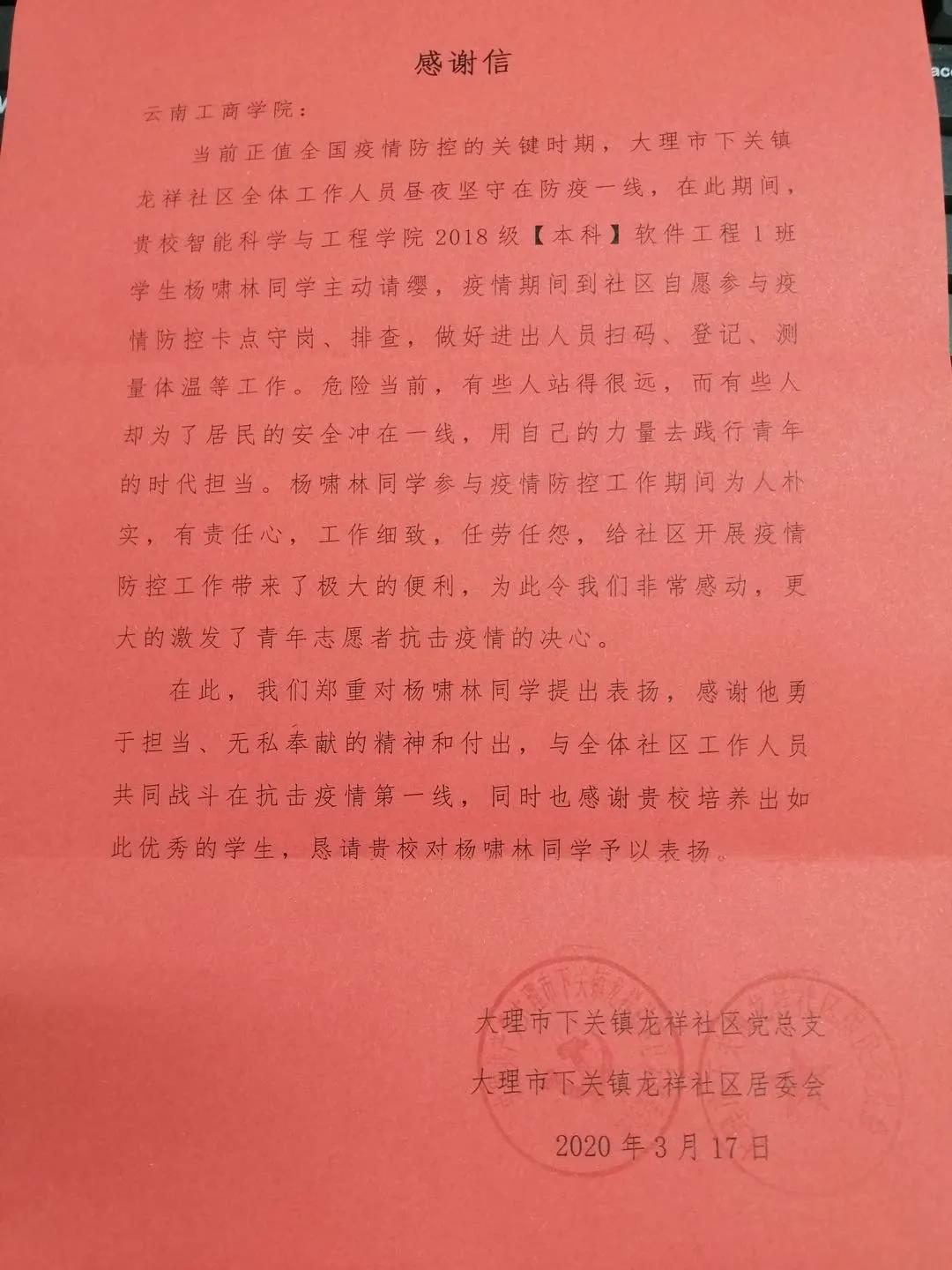 近日,学校收到了来自祖国各地的一封封感谢信,信中对在疫情期间积极参与疫情防控工作的ky开元集团学子表